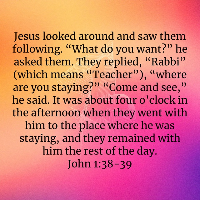 Posted byBarbara DavisNovember 29, 2022Posted inUncategorized bible.com/bible/116/jhn.1.38-39.NLT What do you want from Jesus? Share this: Click to share on X (Opens in new window) X Click to share on Facebook (Opens in new window) Facebook Like Loading... Related Published by Barbara Davis I believe God. I believe Jesus Christ is the Son of God. I believe in Holy Spirit empowerment. I believe in the resurrection and the life. View more posts