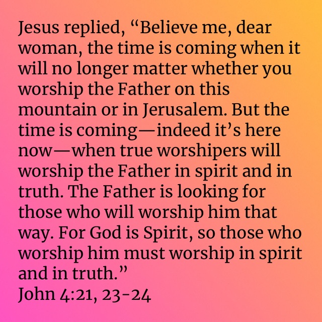 True Worshippers in Spirit and Truth Posted byBarbara DavisMarch 11, 2023Posted inUncategorized bible.com/bible/116/jhn.4.21-24.NLT Share this: Click to share on X (Opens in new window) X Click to share on Facebook (Opens in new window) Facebook Like Loading... Related Published by Barbara Davis I believe God. I believe Jesus Christ is the Son of God. I believe in Holy Spirit empowerment. I believe in the resurrection and the life. View more posts