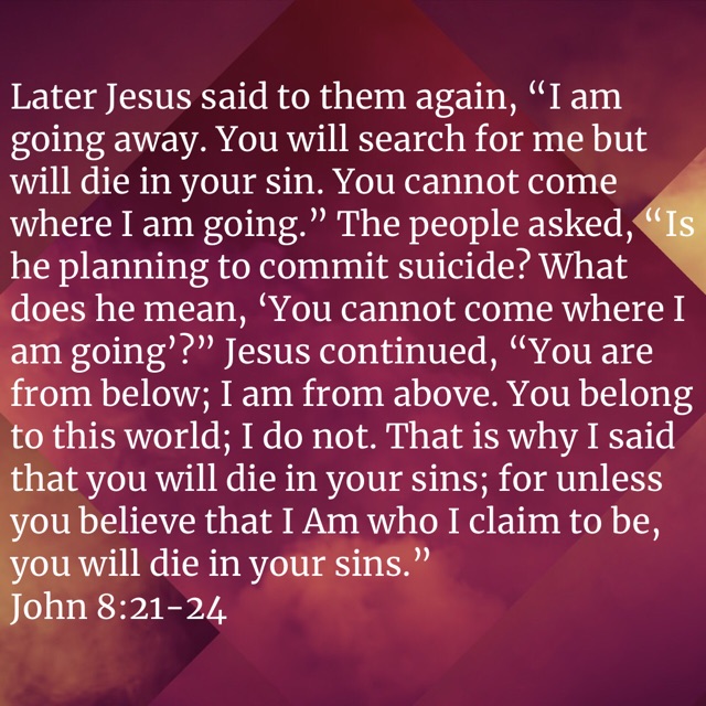 The Way To Eternal Life Posted byBarbara DavisSeptember 21, 2023Posted inUncategorized bible.com/bible/116/jhn.8.21-24.NLT Share this: Click to share on X (Opens in new window) X Click to share on Facebook (Opens in new window) Facebook Like Loading... Related Published by Barbara Davis I believe God. I believe Jesus Christ is the Son of God. I believe in Holy Spirit empowerment. I believe in the resurrection and the life. View more posts
