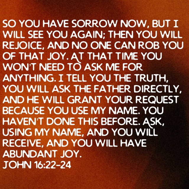 Ask God For Joy Posted byBarbara DavisApril 24, 2024Posted inUncategorized Share this: Click to share on X (Opens in new window) X Click to share on Facebook (Opens in new window) Facebook Like Loading... Related Published by Barbara Davis I believe God. I believe Jesus Christ is the Son of God. I believe in Holy Spirit empowerment. I believe in the resurrection and the life. View more posts